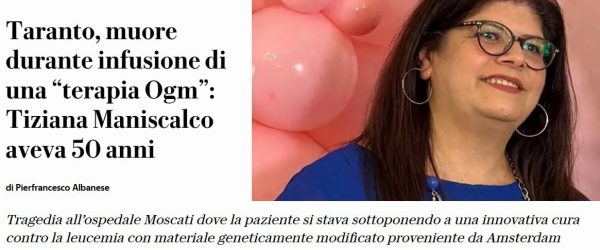 La notizia è vera, ma nel titolo si usa il termine “terapia Ogm” che non vuol dire nulla, a parte dare il proprio contributo alla disinformazione appunto sugli OGM tanto cara a certi ambienti. La terapia che Tiziana Maniscalco stava seguendo è una terapia sperimentale per il trattamento della leucemia, terapia che prevede un’infusione di linfociti autologhi: