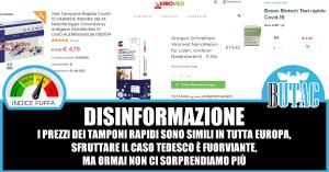 Quello che è sbagliato è dare a intendere che da noi esista solo il tampone da 8 euro da farmacia. Perché anche da noi lo si compra al supermercato esattamente come in Germania, il prezzo è superiore alla Germania, ma non quanto ci dicono. La differenza è che il governo tedesco da marzo ha spinto moltissimo per l’uso dei tamponi rapidi al punto da farne arrivare di gratuiti in farmacia. Io sono cliente di una grande catena di supermercati italiani, faccio la spesa online e un succedaneo di quello che ci viene mostrato, da quando sono usciti i test rapidi, lo pago tra i 4 e i 5 euro.
