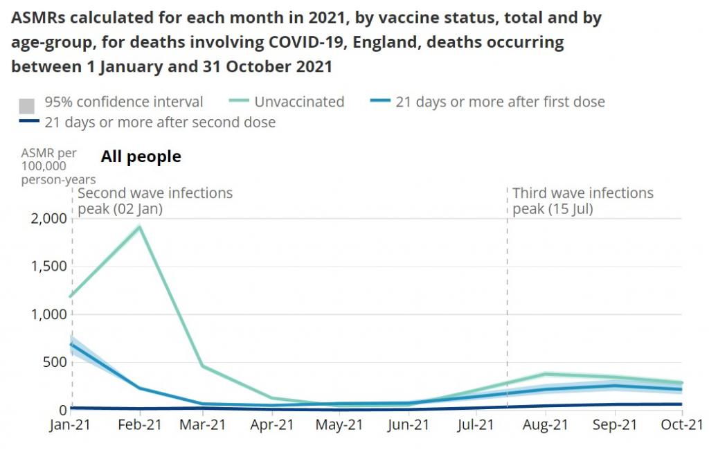 In verde i non vaccinati, in rosa i vaccinati. Ovviamente i rosa sono molti di più rispetto ai verdi, perché le due popolazioni sono molto diverse, chiunque pubblichi un grafico del genere senza affiancarlo con i numeri attuali dei vaccinati e dei non vaccinati sta disinformando. Perché senza quei numeri è impossibile giudicare la tabella qui sopra, basta avere studiato un po’ statistica per rendersene conto. Il meccanico britannico evidentemente non l’ha fatto. Nel grafico che segue potete vedere il tasso di mortalità – si tratta di un grafico ufficiale che arriva dall’Ufficio per la statistica britannico, l’equivalente del nostro ISTAT – tra gennaio 2021 e ottobre 2021 in tutte le fasce d’età, con la linea verde acqua a rappresentare i non vaccinati: