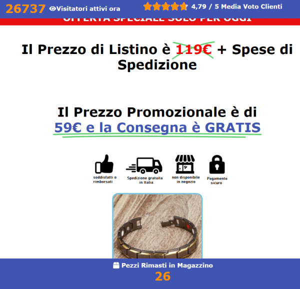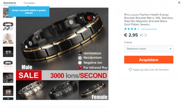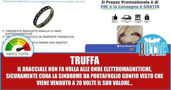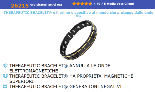Ragazzi non perdete l’offerta di questa settimana, solo per voi abbiamo a un prezzo straordinario un oggetto che risolverà la vostra estate. Avete in programma di andare a manifestazioni di piazza, classici eventi estivi in compagnia di altri amici col gilet arancione? Varicella party con amici dei vostri figli? Come potete essere sicuri che nessuno vicino a voi vi stia avvelenando con le radiazioni? Potete farlo acquistando il bellissimo bracciale terapeutico che vi presentiamo oggi. A un prezzo che oserei dire è praticamente regalato.
