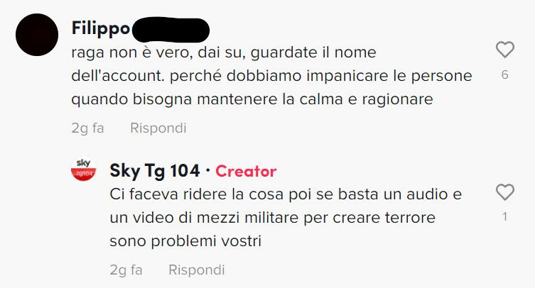- SkyTg104: Ci faceva ridere la cosa poi se basta un audio e un video di mezzi militare per creare terrore sono problemi vostri