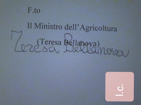 E mostra quella che si suppone essere la firma del nuovo Ministro dell’Agricoltura Teresa Bellanova, la firma è incerta e tremolante come ci aspettiamo la scrittura di un bimbo delle elementari. Andando a cercare l’originale, pubblicata su altra bacheca, troviamo l’autore del post spiegare appunto che si tratta di un falso fatto da lui che decisamente stima poco la neo Ministra.
