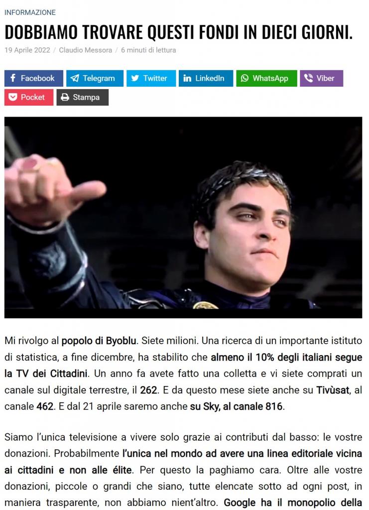 Il modus operandi è sempre lo stesso, mettere ansia ai lettori, convincerli che questi siano gli unici canali che fanno vera informazione, e che se non si dona entro pochissimo chiuderanno. Vale per The Exposé come per ByoBlu.