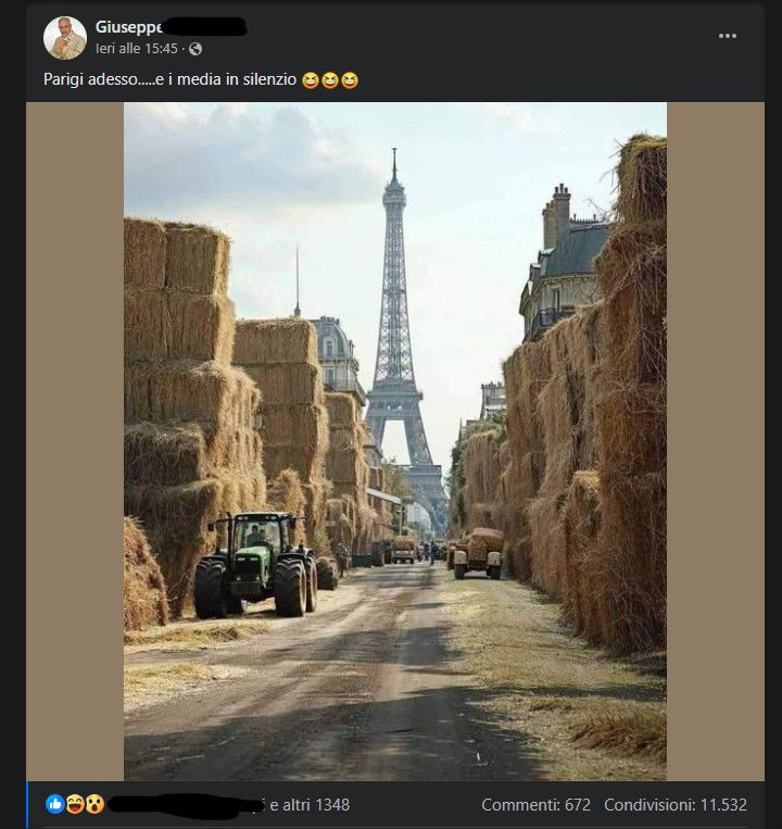 Ovvero si tratta di immagini create con ifonly.ai per mostrare come sarebbe stata Parigi in un universo parallelo in cui si trovava in campagna. Peccato che sul web sia pieno di profili che stanno condividendo quella che vedete in testa all’articolo dando a intendere che sia Parigi, con le strade bloccate da enormi balle di fieno a causa delle proteste dei contadini. Profili come Kristinna (@RED660) su Twitter: