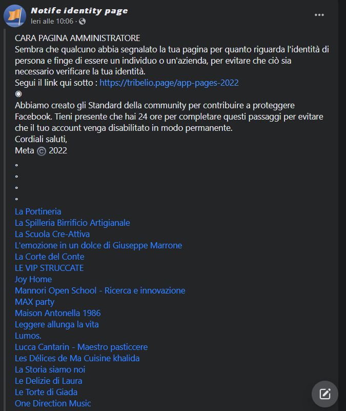 Se avete una pagina e vi arriva un messaggio come questo o simile state attenti non si tratta di un avviso di Facebook o di Meta non cliccate sul link proposto, potrebbe essere un tentativo di appropriarsi della vostra pagina. Una pagina non ha bisogno delle verifiche di cui necessitano i profili personali a meno che non abbiate richiesto un badge di verifica, che serve per evitare che qualcuno si spacci per un personaggio pubblico, un brand o un organizzazione.