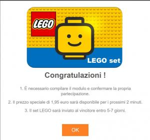 Nell’ultimo step però appare un elemento che mancava in quelli precedenti, un disclaimer a fondo pagina, scritto in lettere grigie su fondo bianco, in caratteri minuscoli… Disclaimer che ci dice che se compiliamo il form sopra non riceveremo un set, bensì: