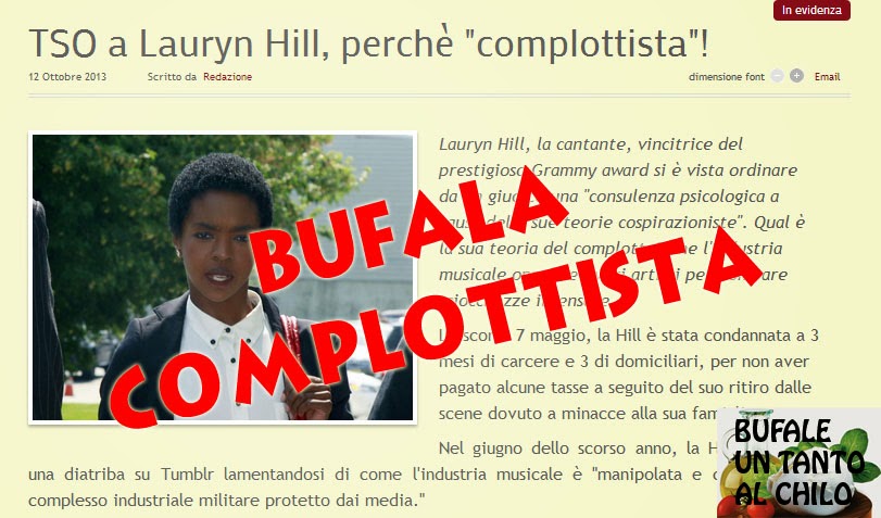 Circola questa storia riguardo Lauryn Hill, che sia stata sottoposta a Trattamento Sanitario Obbligatorio perché reputata una complottista. La fantasia supera la realtà… anche se un fondo di notizia c’è in questa bufalona. Lauryn Hill (A MAGGIO 2013, non ieri) è stata condannata a tre mesi di reclusione in carcere, seguiti da tre mesi di arresti domiciliari per evasione fiscale. L’artista, infatti, non aveva pagato tasse su almeno un milione di dollari di guadagno.