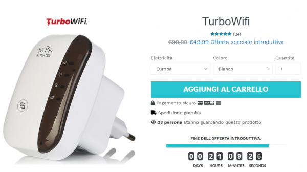 Lo stesso prodotto su Amazon lo trovate a 20 euro. E se lo acquistate su altri canali pagate ancora meno. Ho trovato delle review video dove si parla di questo prodotto, non marcato Turbo Wifi (ma la presa è identica), review dove appunto l’affare viene proposto al suo vero prezzo, tra i 15 e i 20 euro. Si tratta di un oggetto comune, che non farà alcun tipo di miracolo su una rete dove già la connessione sia buona. Serve solo a estendere di un po’ l’area del segnale del nostro router wi-fi. Venderlo a quasi 50 euro, dando a intendere che sia in realtà un prodotto da 100, secondo me è ingannare i propri clienti.