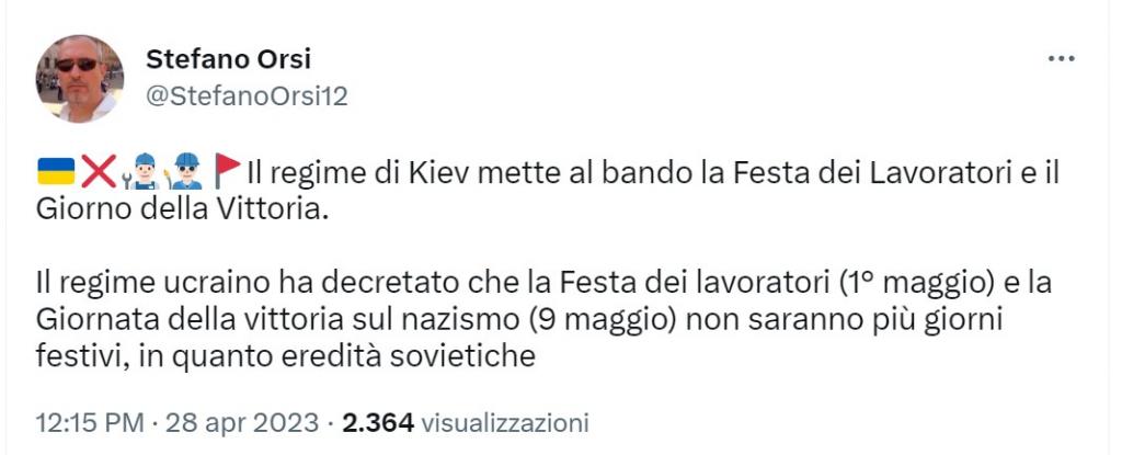 Quello che possiamo aggiungere è che a febbraio alla Verkhovna Rada, il Parlamento ucraino, era stata depositata dall’opposizione al governo una proposta di legge per sospendere le festività dell’8 marzo, del primo e del 9 maggio. Proposta che però non è andata in porto, sia in quanto presentata appunto dall’opposizione al governo, sia perché non aveva senso discuterla visto che tutte le festività, causa legge marziale, sono al momento sospese.