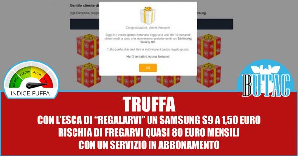Leggete con attenzione, prima mi dicevano che avevo tre possibilità per vincere, ora mi dicono che ho un’ora per avere la possibilità di vincere un S9 a 1,5 euro. Mi chiedono i dati a cui inviarlo, e se proseguo mi chiedono anche i dati della carta di credito su cui mi verrà addebitato un euro e 50 centesimi.
