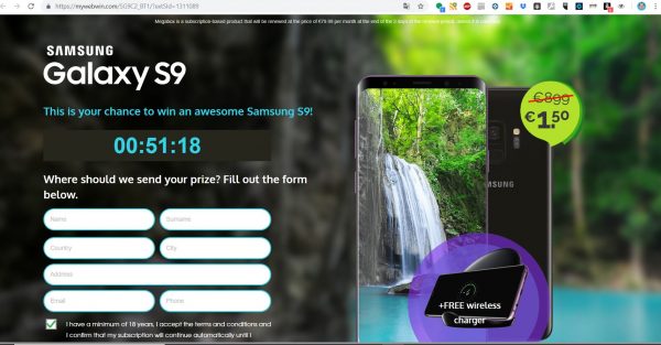 Ovvero inserendo i vostri dati partecipate a una lotteria, che costa 1,5 da subito, ma se non disdicete entro 3 giorni verranno addebitati 79,99 euro ogni mese sulla vostra carte di credito, da qui fino a dicembre 2019. Siamo a marzo, diciamo che siano solo 9 mesi di addebiti, potenzialmente pagherete un ammontare molto vicino a quanto costa un S9, senza nessuna certezza di riceverlo.