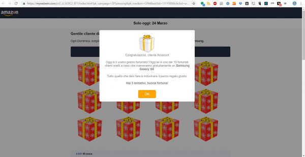 Il messaggio arriva sia via mail che tramite altri canali di messaggistica. Ci troviamo di fronte a un invito, apparentemente da Amazon, per partecipare a un gioco. Dobbiamo indovinare in quel dei pacchi che si vedono sullo schermo contiene il regalo che “Amazon” avrebbe preparato per noi.