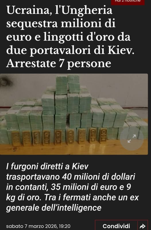 Il 5 marzo 2026 il Centro Antiterrorismo Ungherese (TEK) ha fermato sull’autostrada M5, fuori Budapest, due furgoni blindati con targa ucraina. A bordo: sette dipendenti di Oschadbank, la principale banca statale ucraina, che trasportavano 40 milioni di dollari, 35 milioni di euro e 9 kg d’oro proveniente dalla Raiffeisen Bank International di Vienna, destinati alle casse di Oschadbank in Ucraina. I sette dipendenti sono stati trattenuti con i telefoni sequestrati e senza accesso consolare per oltre un giorno, prima di essere rilasciati e rimandati in Ucraina la sera del 6 marzo. Denaro, oro e veicoli sono rimasti in custodia ungherese.