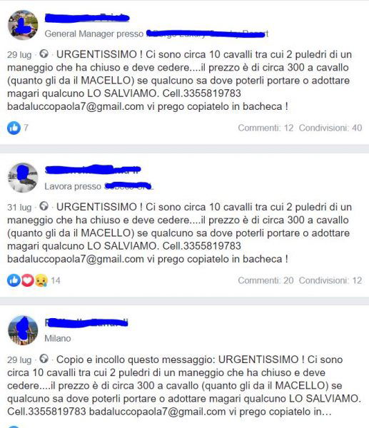 URGENTISSIMO ! Ci sono circa 10 cavalli tra cui 2 puledri di un maneggio che ha chiuso e deve cedere….il prezzo è di circa 300 a cavallo (quanto gli da il MACELLO) se qualcuno sa dove poterli portare o adottare magari qualcuno LO SALVIAMO. Cell.3355819783 badaluccopaola7@gmail.com