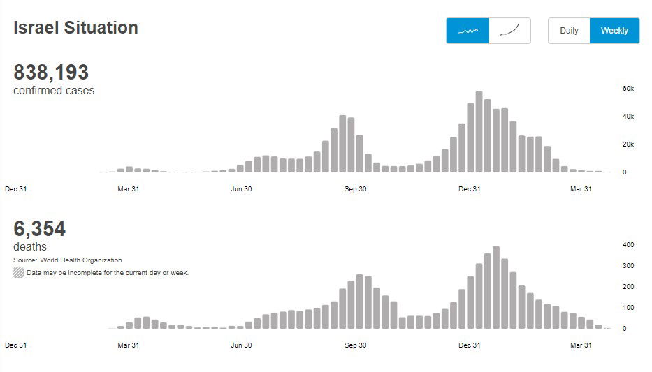 Peccato che basterebbe guardare i dati sul sito dell’OMS per rendersi conto che in Israele, come in tante altre regioni del mondo, la seconda ondata ha fatto più morti, e ha colpito proprio a cavallo di quei due mesi, giustificando così l’eccesso di mortalità.