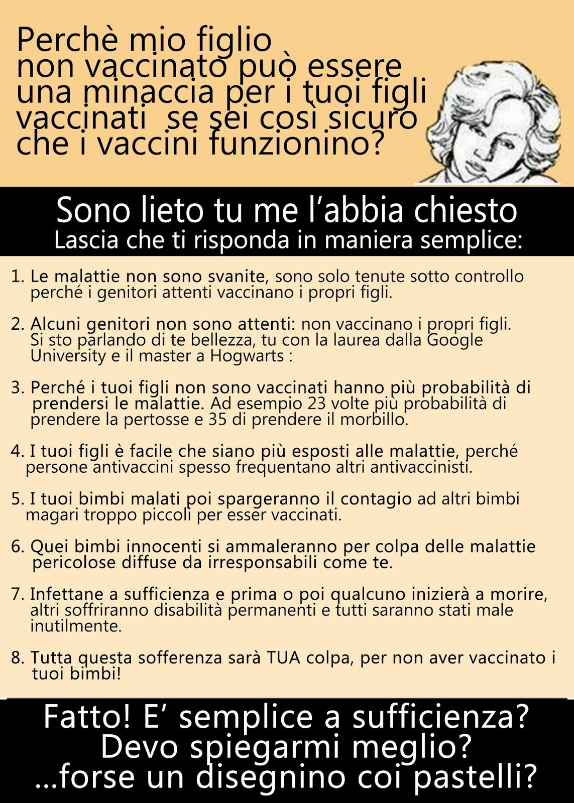 - Alcuni genitori non sono attenti: non vaccinano i propri figli. Si sto parlando di te bellezza, tu con la laurea dalla Google University e il master a Hogwarts.