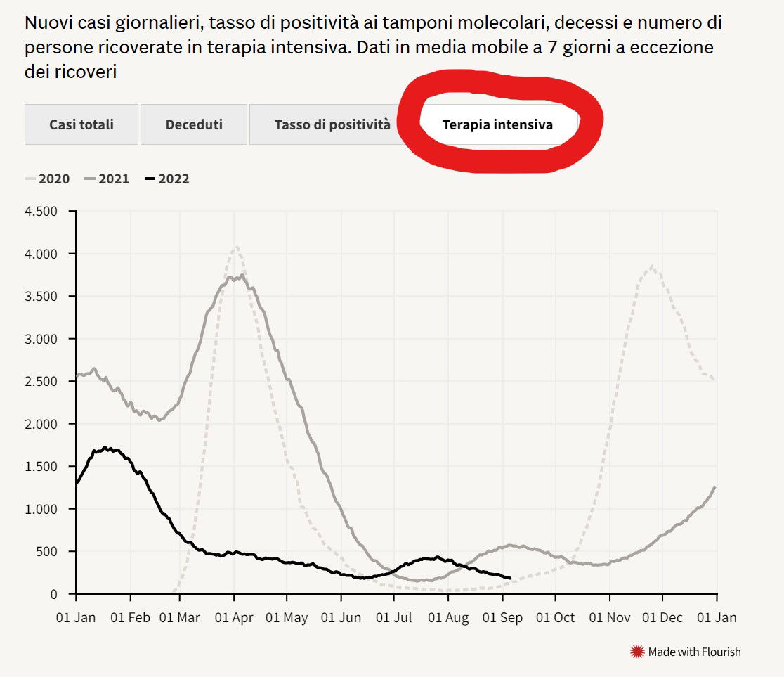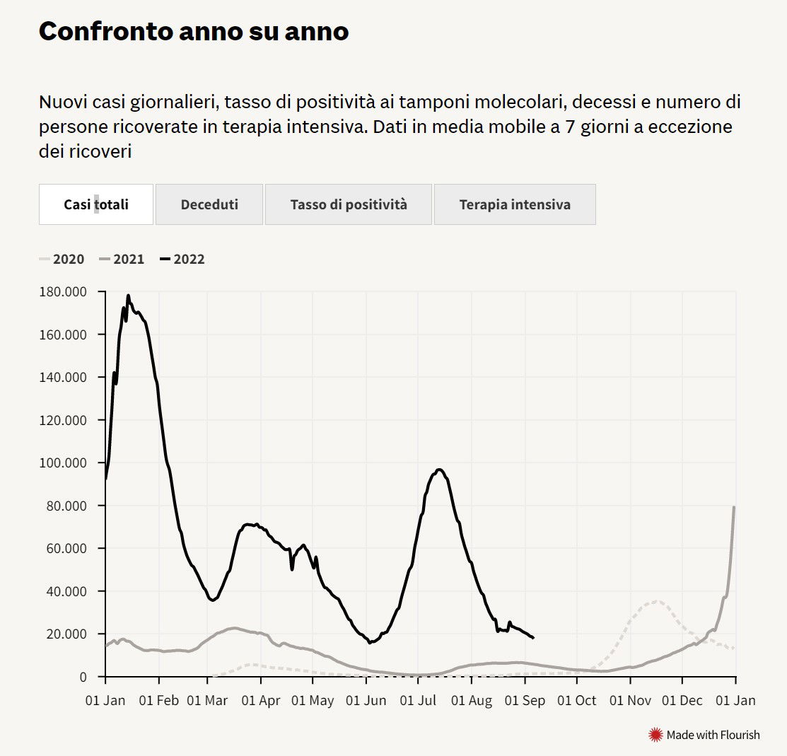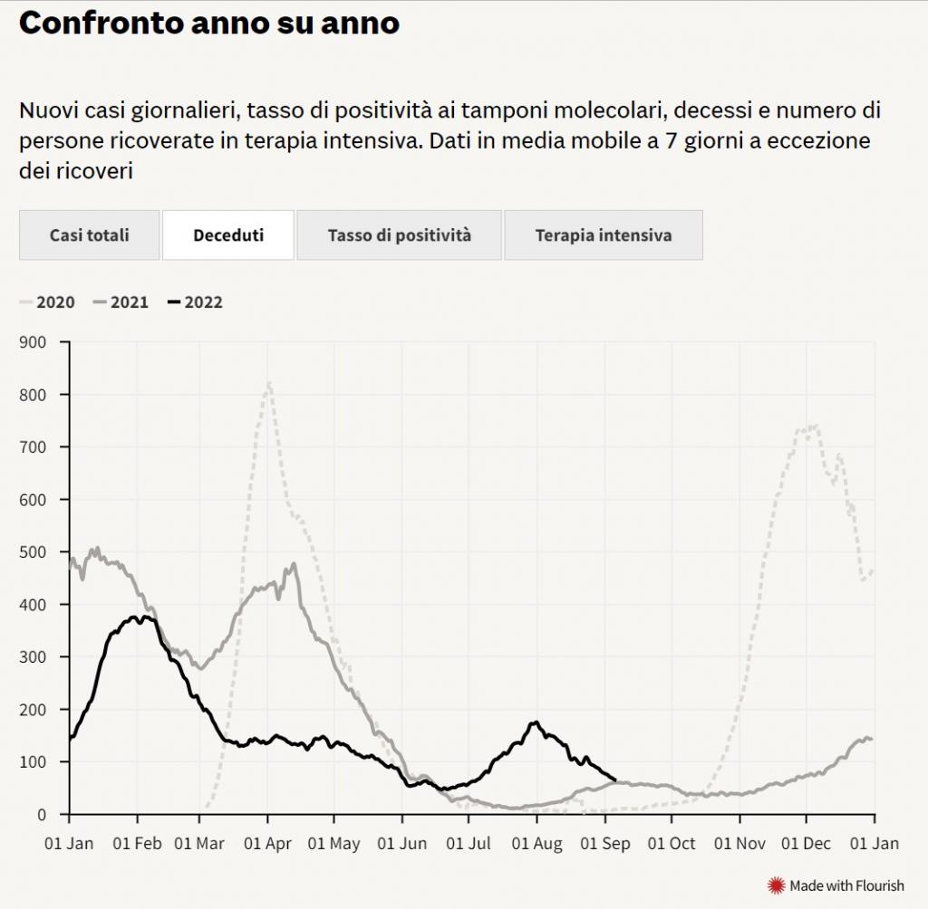 Qui sopra potete vedere le curve dei decessi di 2020, 2021 e 2022, e rendervi conto che per ora il 2022 è comunque l’anno con meno decessi da COVID-19.