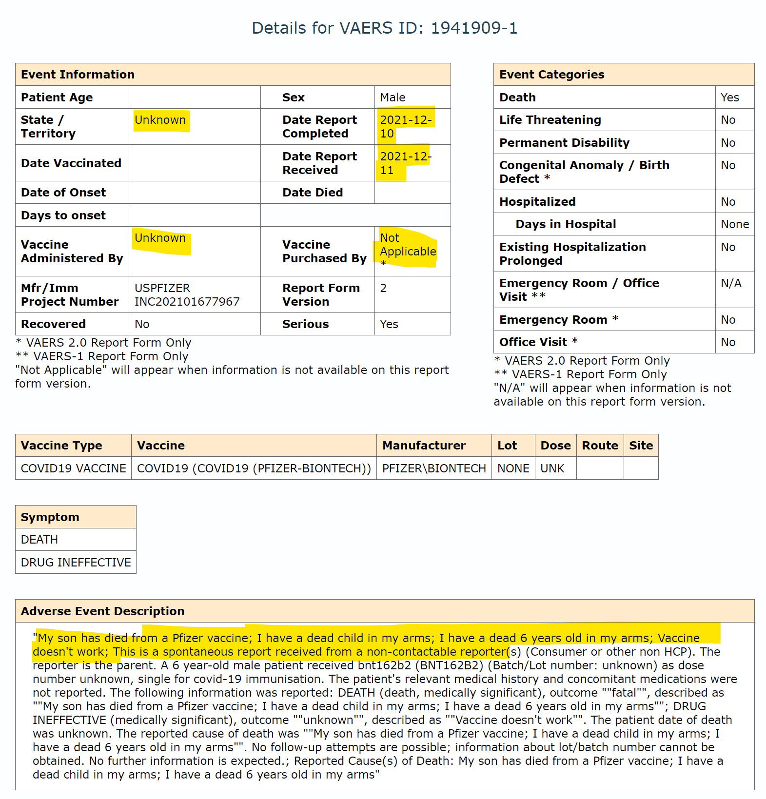 Molti rapporti VAERS elencano «età sconosciuta» per le persone che sono rimaste danneggiate o sono morte a seguito di un vaccino COVID-19. L’analista del VAERS Albert Benavides ha detto che uno sguardo più attento ai riassunti dei rapporti spesso rivela l’età della vittima, ma il VAERS non aggiorna i rapporti per riflettere questo. Se così fosse, il numero di decessi infantili dopo il vaccino sarebbe molto più alto.