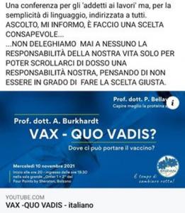 Della conferenza si era già parlato qualche settimana fa, quando un servizio del TG3 era circolato online con un evidente taglio manipolativo. Il servizio raccontava la conferenza stampa indetta da Unterholzner per presentare uno studio, realizzato da alcuni patologi tedeschi, che avrebbe dimostrato i danni fatti dai vaccini contro COVID-19. Ora la conferenza stampa di inizio ottobre si è trasformata in una vera e propria conferenza dal titolo “VAX – QUO VADIS?”, e tanti canali noti per la disinformazione seriale ne stanno parlando.
