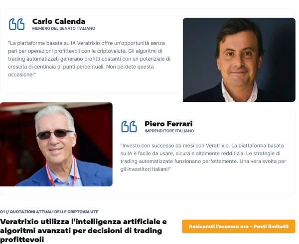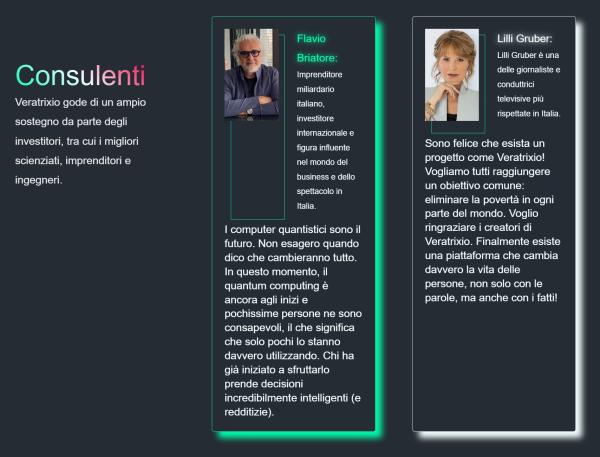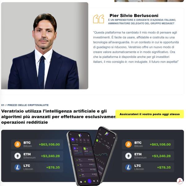 Stavolta partiamo dal marchio che abbiamo incrociato nell’ennesimo finto articolo di Repubblica: Veratrixio, che troviamo in rete con almeno 5 diverse identità web: Veratrixio.com, veratrixio.net, veratrixio.org, veratrixio-invest.com e veratrixio.vip. Cinque diverse piattaforme per lo stesso brand fuffa legato al trading online.