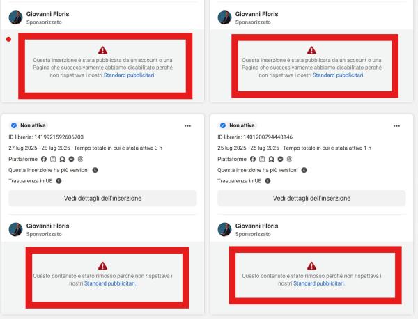 Eppure, pur distribuendo post sponsorizzati che non rispettano gli standard, è da luglio che la pagina li diffonde e non viene chiusa. Se vi chiedete come mai la risposta è semplice: ogni volta che pubblica un post sponsorizzato Meta incassa, e a quel punto Meta non è così sicura che sia il caso di rimuovere in toto la pagina, al massimo ritiene che sia sufficiente punirla rimuovendo di volta in volta i post che l’algoritmo ritiene non adatti, ovviamente non prima di averli lasciati online per qualche ora (dal minimo di due a un massimo che ho stimato in circa dodici). Così la pagina può continuare a pubblicare annunci, Meta a incassare e gli utenti a venire truffati.