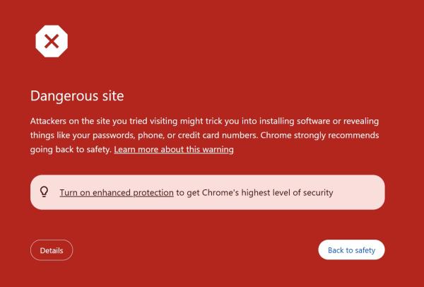 Attackers on the site you tried visiting might trick you into installing software or revealing things like your passwords, phone, or credit card numbers. Chrome strongly recommends going back to safety. Learn more about this warning