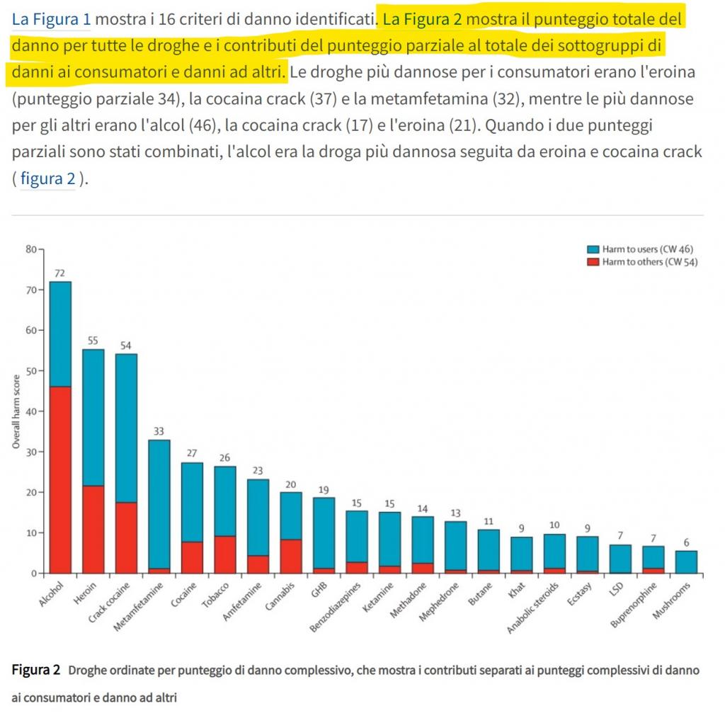 Qui potete leggere uno studio che tra le varie droghe (perché questo è) classifica l’alcol al primo posto come punteggio di danno complessivo, al secondo posto troviamo l’eroina. Il grafico mostra in rosso il danno che la sostanza provoca agli altri, in blu quello che porta al consumatore. L’alcol è al primo posto come danno nei confronti degli altri, al quarto posto come danno che causa a chi lo consuma, ma complessivamente la somma dei due ci mostra come l’alcol sia la più pericolosa tra le sostanze analizzate.