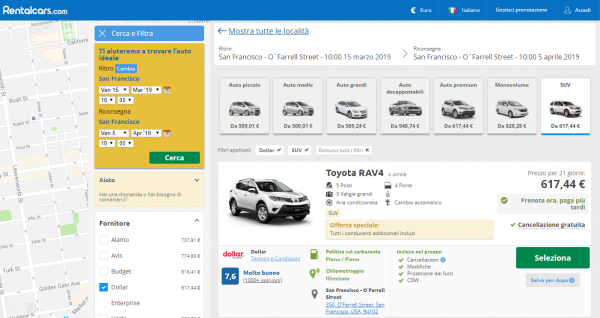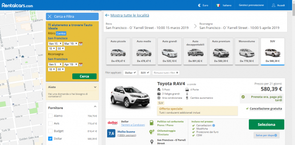 Ma ricordavo però che c’erano sconti sui noleggio delle automobili, e siccome sto programmando un viaggio negli USA a marzo uno sconto sulla macchina poteva servirmi. Spendo quindi 300 sorrisi per acquistare uno sconto del 10% su Rentalcars.com. I sorrisi sono punti che vengono accreditati a ogni ricarica. Mi viene inviato un link Vodafone attraverso il quale accedere al sito Rentalcars.