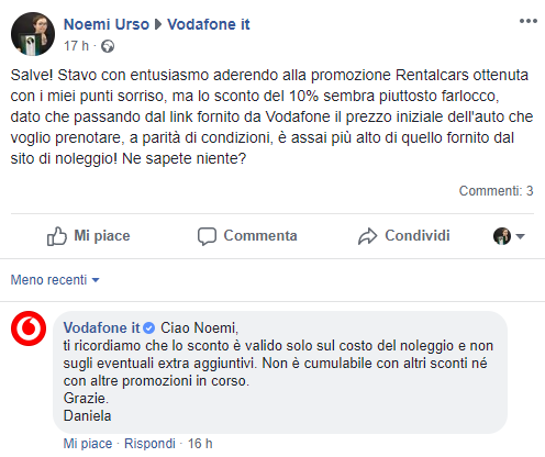 Nel frattempo mi ha chiamato Rentalcars a cui ho spiegato l’intera situazione e che è stata così carina da bloccare il prezzo più basso mentre aspetto una risposta dalla Vodafone (che dubito arriverà, ma la speranza è l’ultima a morire…).