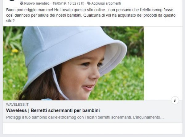 Ma il gioco è chiaro, prima si fanno girare mille mila articoli dove si fa allarmismo sull’elettrosmog, poi a seguire si mettono in giro pubblicità per un prodotto di cui, senza l’allarmismo, non avresti sentito il bisogno. Ovvio che dopo che hai passato mesi a leggere dei possibili pericoli del 5G anche un cappellino per difendere i tuoi bimbi può attirare la tua attenzione.