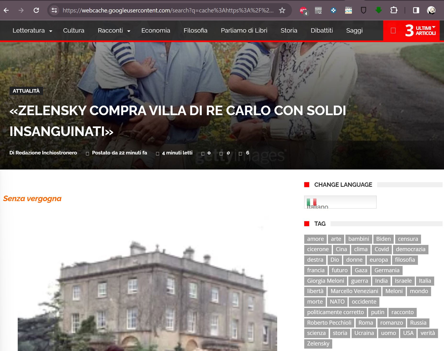 La notizia che trattiamo è di quelle che avete già visto in precedenza, ma stavolta la villa acquistata da Zelensky è di re Carlo, mentre un’altra volta era in Egitto: poco conta dove siano collocate, l’importante è dare a intendere ai propri follower che Zelensky usi i soldi dell’Ucraina per spese pazze e per vivere nel lusso mentre in Ucraina si muore per sue decisioni scellerate (e non perché l’Ucraina è un Paese sovrano che è stato invaso da un Paese confinante).