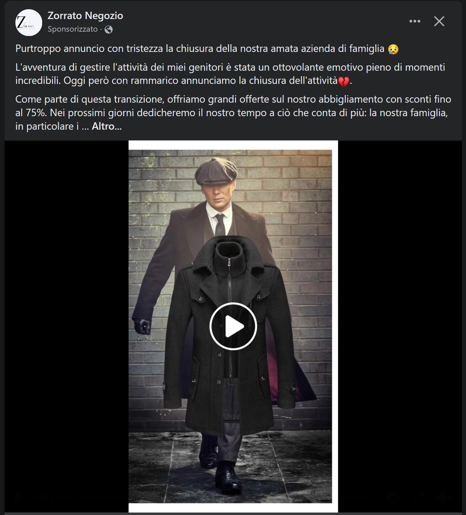 Ennesimo articolo per denunciare l’ennesimo giro di post sponsorizzati a pochi giorni dalla fine dell’anno. Stavolta il brand che circola è Zorrato Negozio, che pubblica post sponsorizzati accompagnati da immagini della serie tv Peaky Blinders, e da questa didascalia: